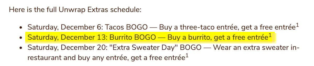 🌮 BOGO Chipotle: Dinner could be a lot cheaper next week thanks to an upcoming buy one get one burrito deal on December 13th.