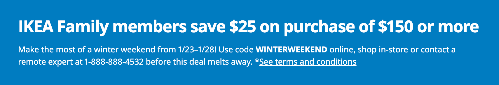 šŖ $25 OFF $150 at IKEA: With many of you considering furniture purchases right now (based on all the requests I received last week), if you use the code āWINTERWEEKENDā online or in store you can take advantage of this promo, but only until this Wednesday January 28 and you must be an IKEA Family Member (Free to join).